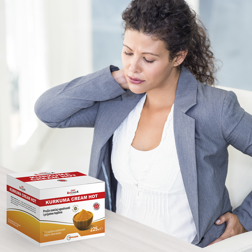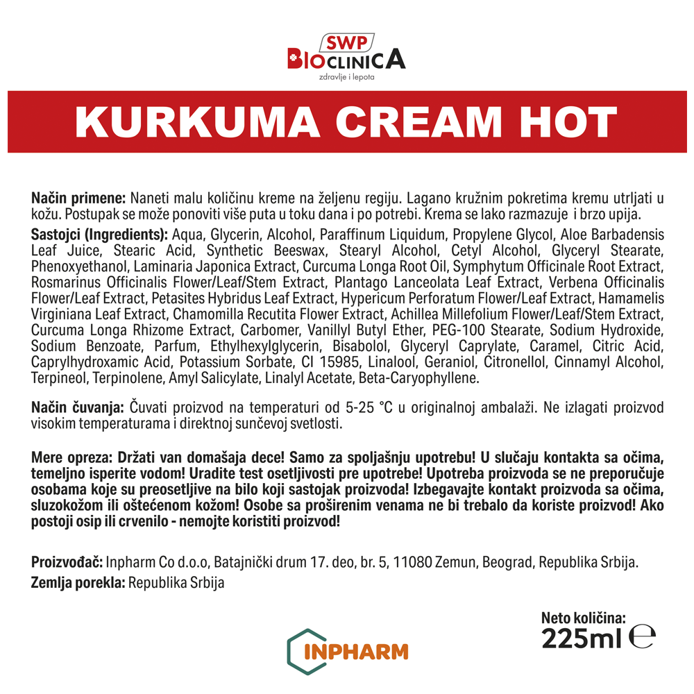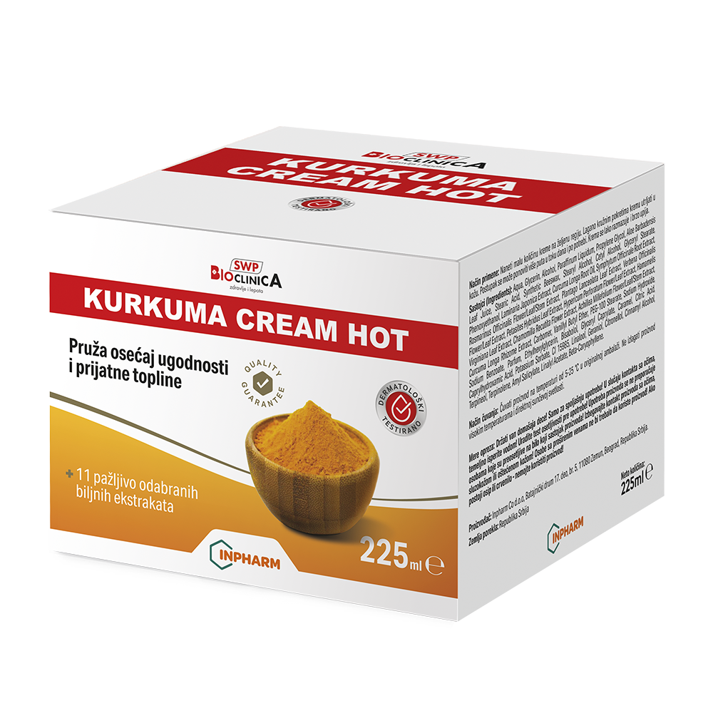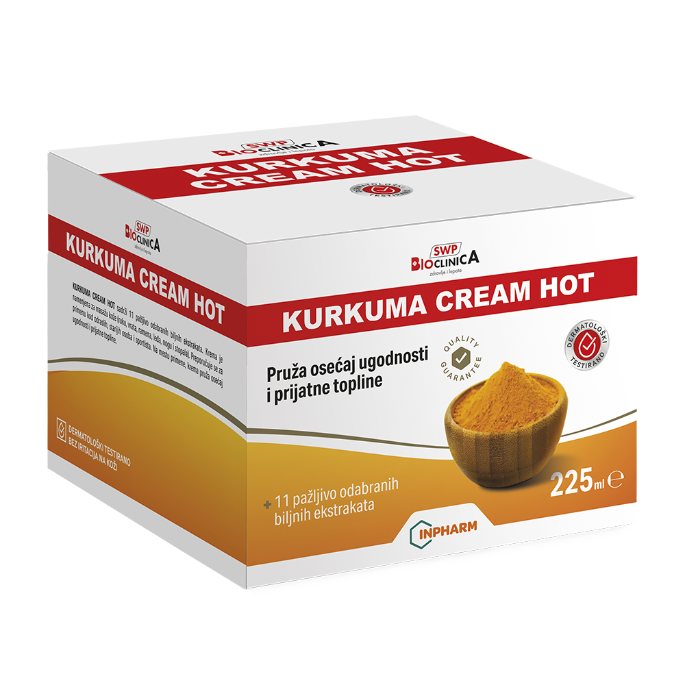Krema za masažu vrata, ramena, leđa, zglobova ruku i nogu, sa snažnim efektom zagrevanja na mestu nanošenja. Pomaže kod reumatizma, artritisa, artroze, regeneracije zglobova i mišića, poremećaja periferne cirkulacije, sportskih povreda. Doprinosi smanjenju bola, učestalosti upala, otoka i ukočenosti, tretira mišiće i zglobove i vraća fleksibilnost tetivama. Doprinosi smanjenju bolova u kičmenom stubu – vratne, grudne i lumbalne regije, bolova u zglobovima ruku i nogu i bolova u mišićima i tetivama. Regeneriše i opušta umorne noge i stopala i daje osećaj udobnosti. Masiranjem kože kod sportista postiže se opuštanje mišića. Na mestu primene krema pospešuje perifernu cirkulaciju i prokrvljenost kože i pruža osećaj ugodnosti i prijatne topline koja dugo traje. Kurkuma Cream Hot krema u svom sastavu sadrži etarsko ulje kurkume i ekstrakat kurkume uz dodatak 11 biljnih ekstrakata. Zahvaljujući visokoj koncentraciji biljnih ekstrakata i njihovoj međusobnoj sinergiji, krema takođe popravlja strukturu kože, hrani i štiti kožu, čuva odbrambeni mehanizam kože i time njene funkcije, podstiče sposobnost obnavljanja i regeneracije i održavanja vezivnog tkiva kože u dobrom stanju.