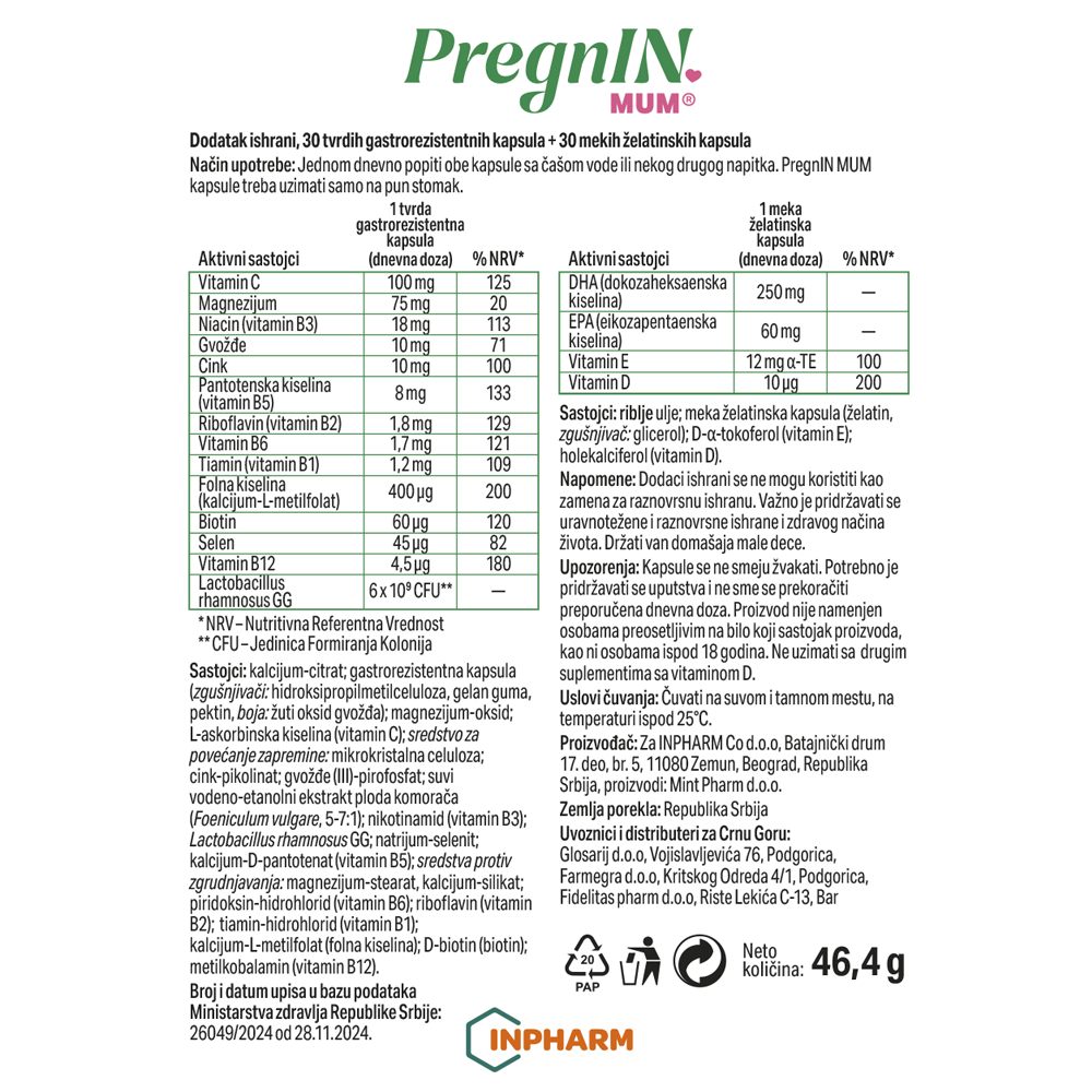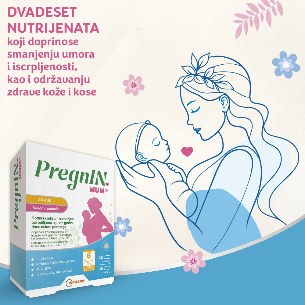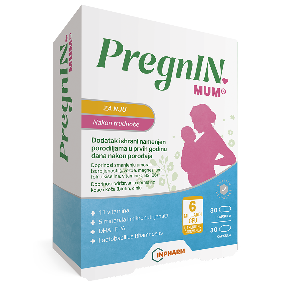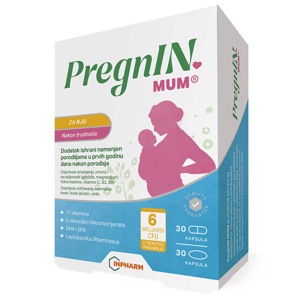 PregnIN mum je dodatak ishrani sa vitaminima, mineralima i Lactobacillus rhamnosus koji je namenjen porodiljama tokom prvih godinu dana nakon porođaja, nezavisno od toga da li doje ili ne.